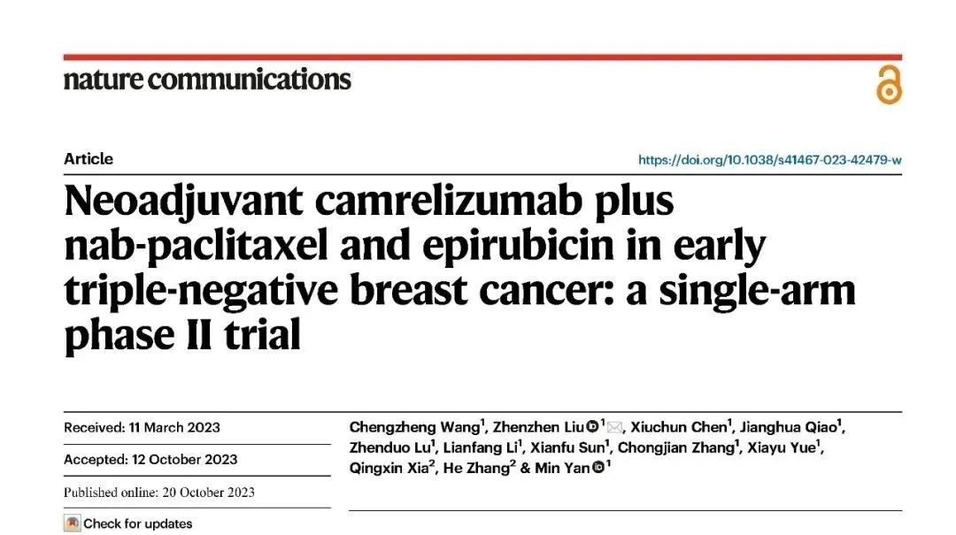 卡瑞利珠单抗联合白蛋白紫杉醇及表柔比星新辅助治疗早期三阴性乳腺癌的一项单臂、单中心前瞻性研究发表于Nature Communications