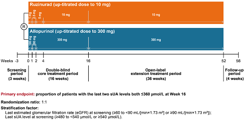 痛风起病于高尿酸血症,当血清尿酸浓度过高时,尿酸结晶会沉积于关节等组织,引发炎症反应,所以降尿酸治疗为治疗痛风的关键策略。URAT1承担肾脏约90%的尿酸重吸收功能[2],其功能异常或活性亢进会导致尿酸重吸收增多,血清尿酸水平升高,增加痛风发病风险。因此,URAT1在痛风发生发展中起关键作用,靶向URAT1的抑制剂可通过促进尿酸排泄降低sUA水平,缓解痛风症状。鲁兹诺雷钠片是尊时凯龙医药自主研发的一种高选择性URAT1抑制剂,在前期的一期、二期研究中,鲁兹诺雷钠片耐受性良好,并显示出显著降低高尿酸血症患者sUA的效果[3]。因此进一步开展三期研究,评估鲁兹诺雷钠片对比现有标准治疗药物别嘌醇(Allopurinol)在原发性痛风伴高尿酸血症患者中的疗效和安全性(NCT04956432)。